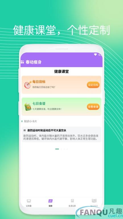 春动瘦身最新版是一款专门为用来帮助瘦身的软件,可以根据自己的身体情况来记录,将自己的体重变化进行查看,在软件上去进行健康的日常规划,每天都能提醒自己去进行运动计划!