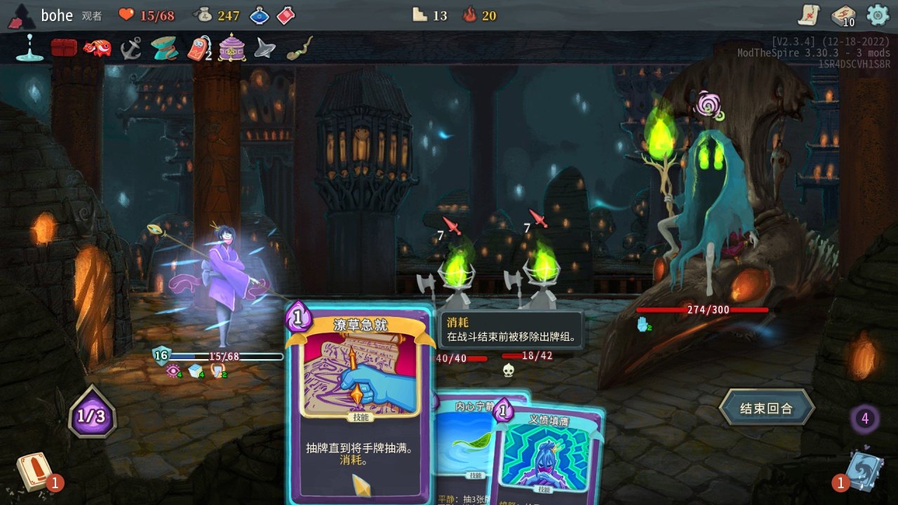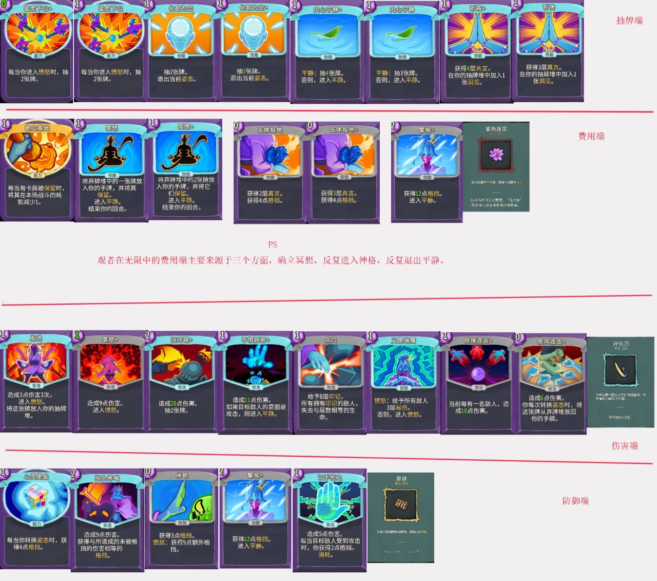 局内启动:通过消耗性抽卡、攻击卡、可以消耗其他卡牌的卡牌(净化、回春等)来简化套牌。)和只能使用一次的能力卡,留下上述的抽牌端、费用端、伤害端和防御端以实现无限。