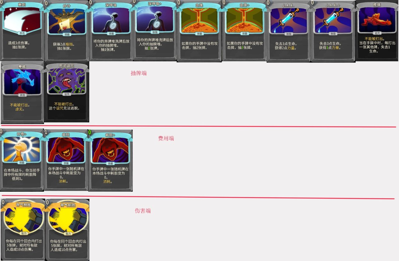 费用端:费用端是指拥有可以多次赚取费用的卡片和遗物或不拥有。有两种情况可以被视为费用方。第一,卡被敲后,可以0费玩或者卡本身是0费卡。第二,可以帮助我们多次赚取费用的卡和遗物,以确保其他港口有费用可打。比如战术大师,放血,内核加速,疯狂+,日晷等等。带有牺牲和愤怒等消费条目的卡不能用作无限费用,因为它们只能使用一次。